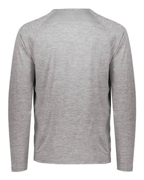 4.25 oz./yd², 87/13 polyester/elastane heathered knit Coolcore® fabric engineered to distribute moisture quickly 92/8 polyester knitted mesh/elastane knit inserts Moisture-wicking performance UPF 50+ protection UPF 25+ protection on mesh inserts Crew neck collar Raglan sleeves Tagless label