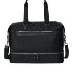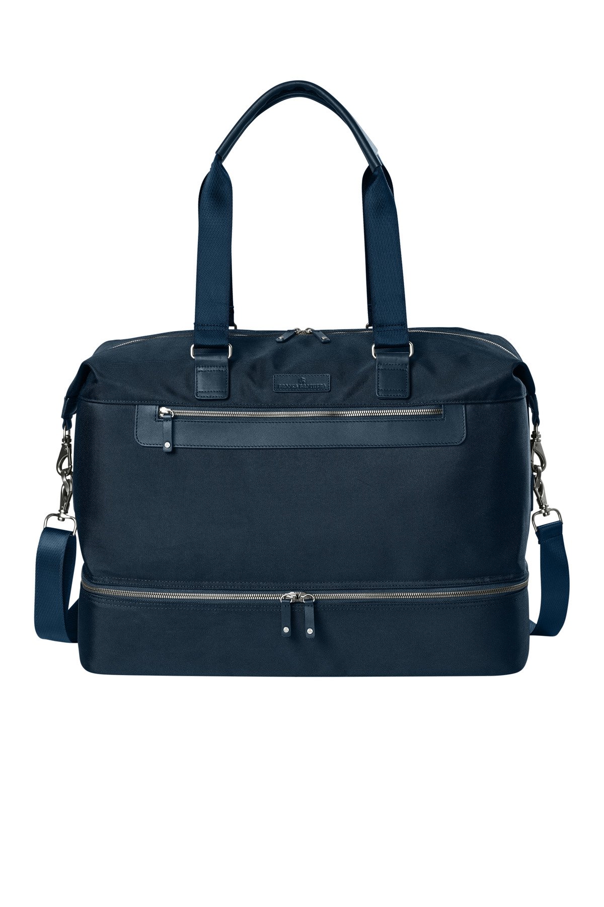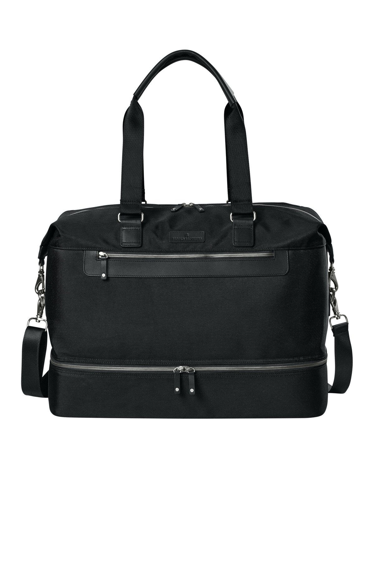 500D x 750D polyester with knitted fabric backing 420D polyester lining Genuine leather trim and details Front zippered pocket for decoration access Zippered main compartment with interior slip pocket and zippered pocket Zippered shoe compartment at base Dedicated padded laptop compartment Double leather-wrapped web handles Removable, adjustable shoulder strap with shoulder pad Leather feet at base Leather zipper pulls with Brooks Brothers logo rivet Exterior debossed Brooks Brothers leather label Trolley pass through with concealed zippered pocket Laptop compartment: 11’h x 15.75’w; fits most 17′ laptops Dimensions: 14’h x 19.25’w x 9’d Capacity: 2,440 cu. in./40 L Weight: 3.5 lbs./1.6 kg Note: Bags not intended for use by children 12 and under.