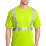 Stay safer on the jobsite in this high-visibility t-shirt that works as hard as you do. | ANSI/ISEA 107 Class 2 certified 5.9-ounce, 100% polyester interlock Wicks moisture UPF rating of 50+ 2-in. wide reflective taping on front and back Left chest pocket for pens and notes