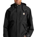 Carhartt’s Shoreline Jacket is made of durable nylon with a waterproof, breathable membrane: sweat can get out, rain can’t get in. 7.3-ounce, 100% nylon oxford shell Storm Defender ® waterproof, breathable membrane Rain Defender ® durable water repellent 10K/10K waterproof/breathable protection rating Polyester mesh lining in body, nylon taffeta lining in sleeves and hood Snap-on/detachable visored hood with drawcord adjuster Vislon ® front zipper with chin guard and double outer storm flap Left chest map pocket with waterproof Vislon ® zipper Two interior pockets with hook and loop closures Two lower-front pockets with zippered closures and storm flaps Inner sleeve storm cuffs Carhartt-strong, triple-stitched main seams Carhartt label sewn on chest pocket Loose fit