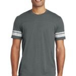 This tee has a retro, game-day inspired look. 4.5-ounce, 60/40 combed ring spun cotton/poly, 32 singles 1×1 rib knit neck Tear-away label Distressed printed stripes at sleeve Front and back yoke Shoulder to shoulder taping