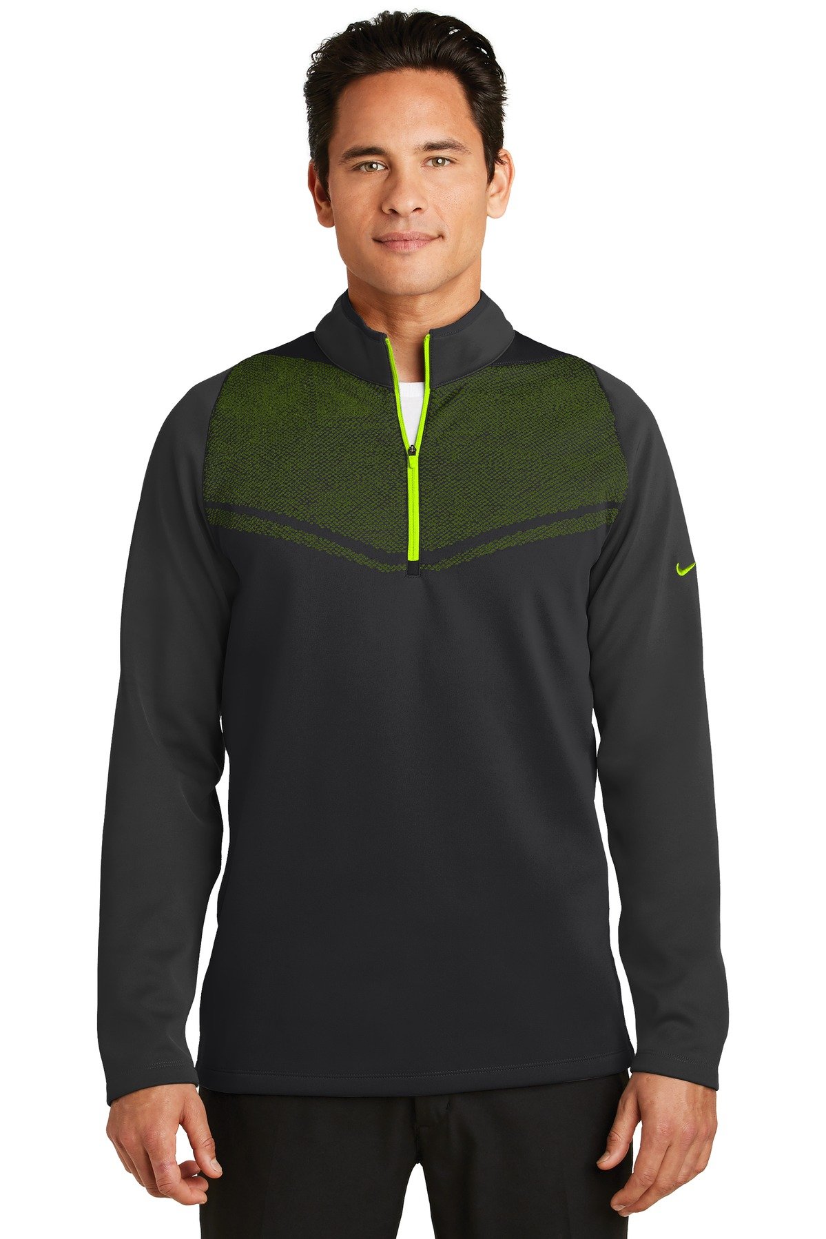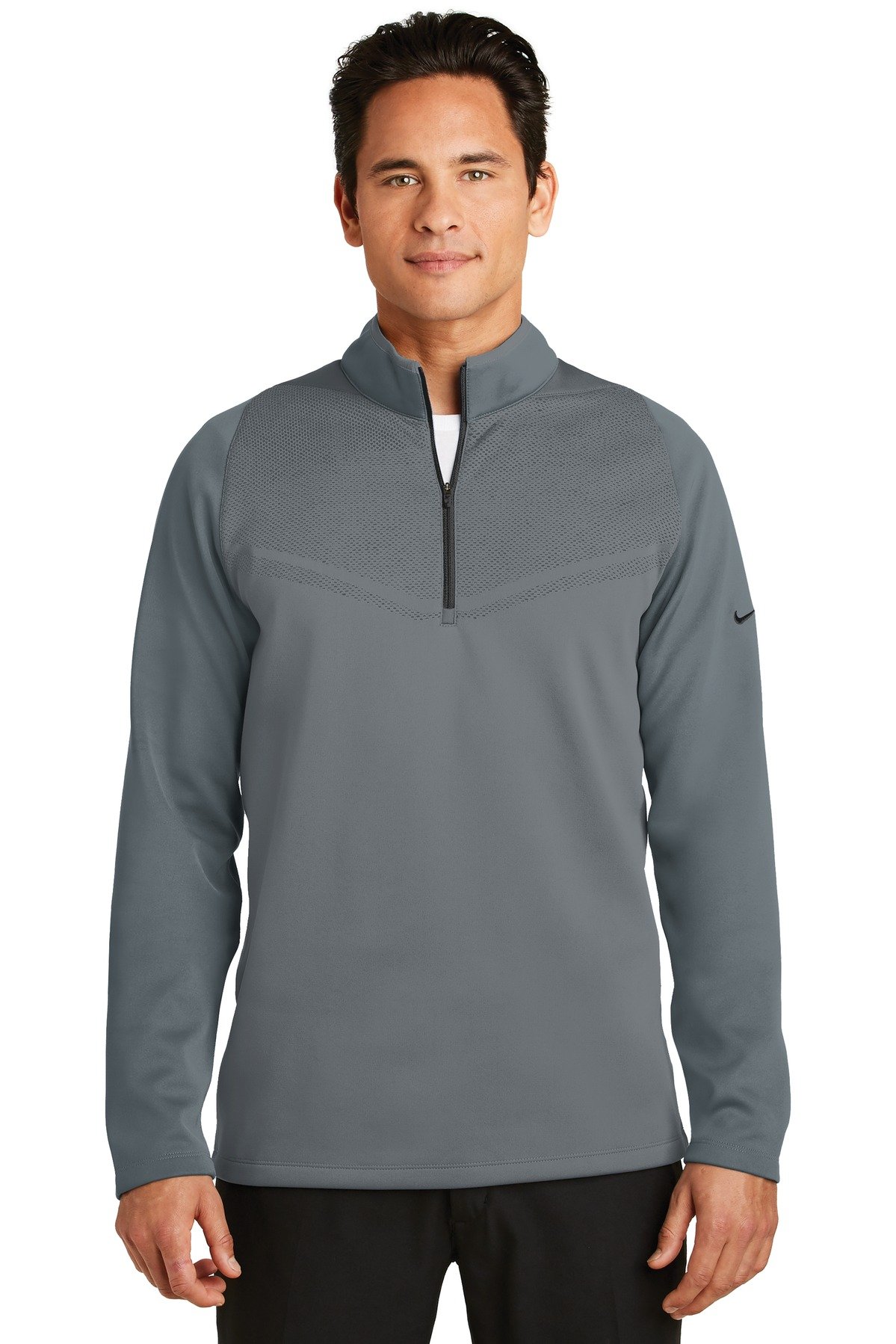 For lightweight, allover warmth and temperature regulation, this cover-up excels with Therma-FIT fabric. The chevron design across the chest provides a striking pop of color detail. Distinctive contrast color at the neck and zipper, plus a brushed interior makes this versatile layering piece an everyday essential. Details include a reverse coil zip-through collar, open cuffs and an open hem. The contrast Swoosh design trademark is embroidered on the upper left sleeve. Made of 10.2-ounce, 100% polyester Therma-FIT fabric.