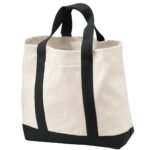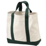 Carry necessities with a touch of traditional style. | Durable 10-ounce, 100% cotton twill, contrast canvas bottom Deep exterior pocket for easy decoration Polyester web handles Dimensions: 14′ h x 14.5′ w x 5.5′ d; Approx. 1,117 cubic inches Note: Bags not intended for use by children 12 and under. Includes a California Prop 65 and social responsibility hangtag.
