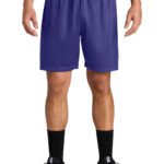 Keep up the pace in a moisture-wicking, open hole mesh short with PosiCharge technology which locks in your logo. 3.4-ounce, 100% open hole poly mesh with PosiCharge technology 2.5-ounce, 100% poly tricot lining Moisture-wicking Open-hole mesh 7-inch inseam Elastic waistband with continuous loop drawcord Tear-away label